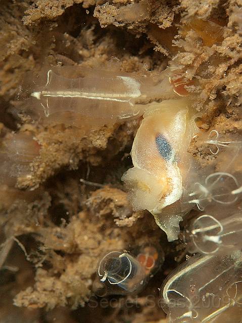 Lightbulb tunicates - Clavelina lepadiformis apparently being attacked by a nudibranch - Goniodoris nodosa (an unusally colourful variant, they are normally purely white)
